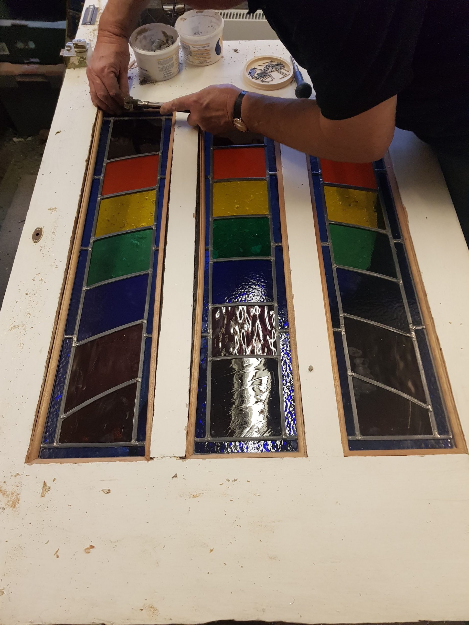 Gary had contacted us about the window in his front door being damaged. It had cracked joints from the door slamming over the years and the window was in poor shape struggling staying together. We arrived at Gary’s house and decided to take the door of instead of the window because of how fragile it was. We then laid the door onto our workbench on site and began soldering the cracked joints. We polished the new joints to give the same effect so no repair was even noticeable. We attached copper wire to 2 joints where it could be attached onto a bar for security and to avoid future bowing. Thanks again Gary.